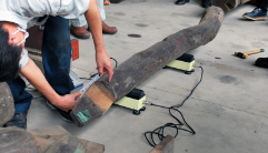 古材倉庫に入荷後、高圧洗浄・金属探知機による針等の金属の撤去・ 目視等による検査と木材強度(ヤング係数)の測定・含水率の測定等を行い、データ化して出荷します。